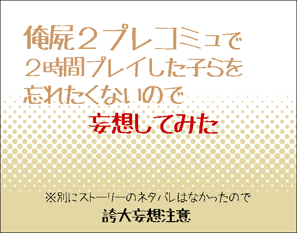 お久しぶりでございます。俺屍2、主にtwitterでしか報告する暇がなかったのですが、発売日からゆるく遊んでいます♪